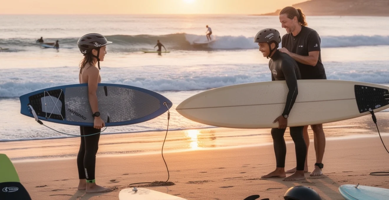 Pour le surf, le ticket d’entrée est plus élevé. Une planche soft-top débutant de bonne facture coûte généralement entre 300 et 500 €, à laquelle il faut ajouter un leash (30 à 40 €), éventuellement des dérives de rechange, une housse de transport (60 à 150 €) et la même combinaison néoprène. Dans la pratique, un équipement complet de surf débutant oscille entre 450 et 800 €. À cela peuvent s’ajouter des cours dans une école de surf ou de bodyboard, fortement recommandés au départ : comptez de 30 à 50 € la séance collective d’1h30, souvent dégressif en pack.
