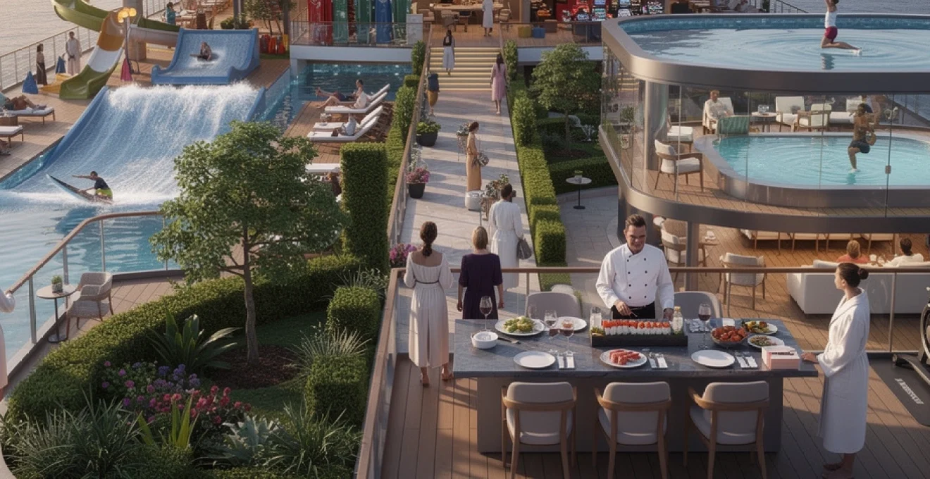 e la manière dont vous circulez à bord. Sur certaines classes Oasis de Royal Caribbean, le quartier Central Park recrée un véritable jardin urbain à ciel ouvert, avec plus de 20 000 plantes, des sentiers sinueux et des terrasses de restaurants intimistes. Quelques ponts plus haut, les aquaparcs suspendus et les zones ludiques comme le Perfect Storm ou les toboggans vertigineux de l’Icon of the Seas transforment la proue et la poupe en véritables parcs d’attractions. Ce zonage spatial, inspiré de l’urbanisme contemporain, permet de séparer les espaces familiaux des zones adultes-only, de fluidifier les flux et de proposer des ambiances radicalement différentes au fil de vos promenades quotidiennes.