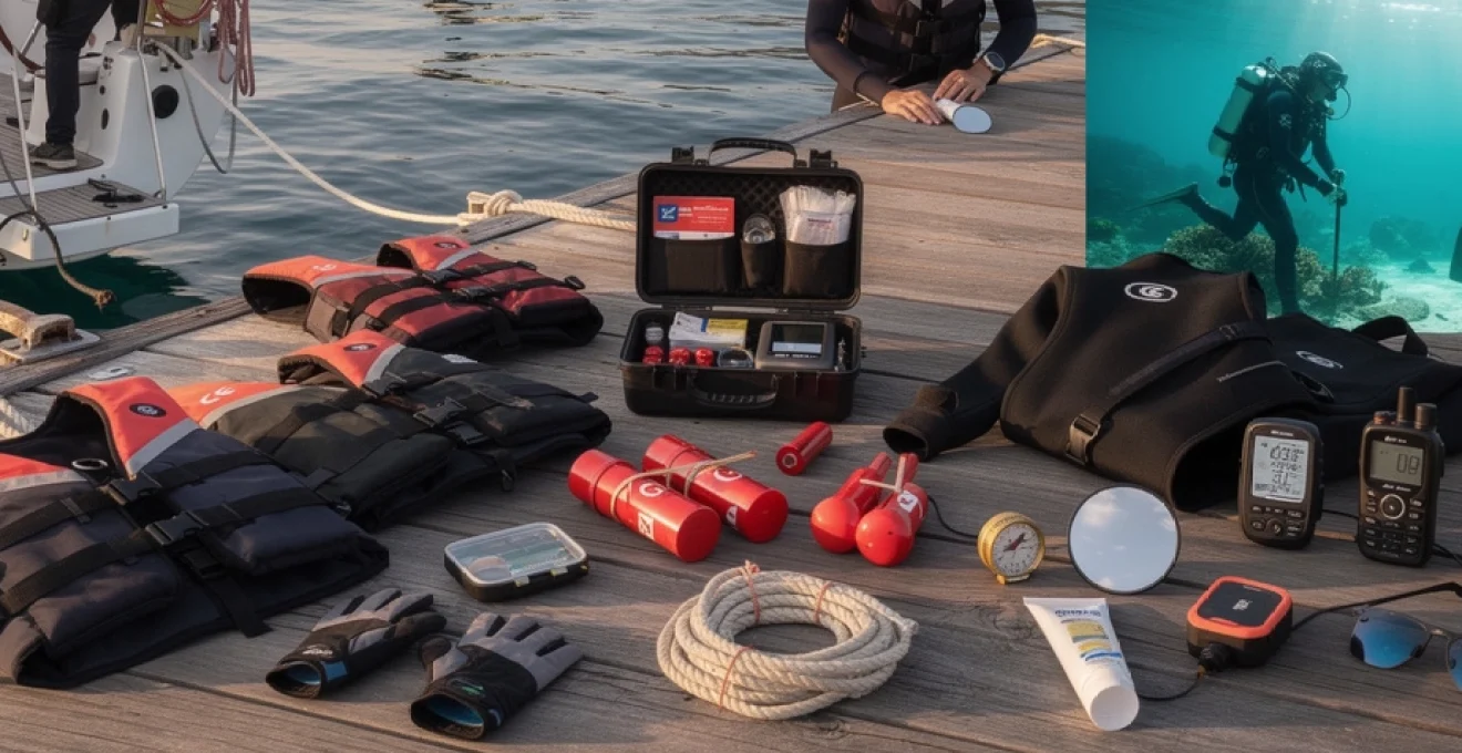 Les combinaisons fines (2 à 3 mm) protègent à la fois des frictions avec le corail, des méduses éventuelles et du soleil, tout en apportant un léger confort thermique lors des longues immersions. Des palmes chaussantes légères suffisent pour le snorkeling, tandis que les palmes réglables avec bottillons néoprène sont idéales pour la plongée bouteille. Enfin, un parachute de palier, un sifflet et un miroir de signalisation complètent utilement le dispositif de sécurité, surtout lorsque la houle peut masquer les plongeurs en surface aux yeux des bateaux de passage.